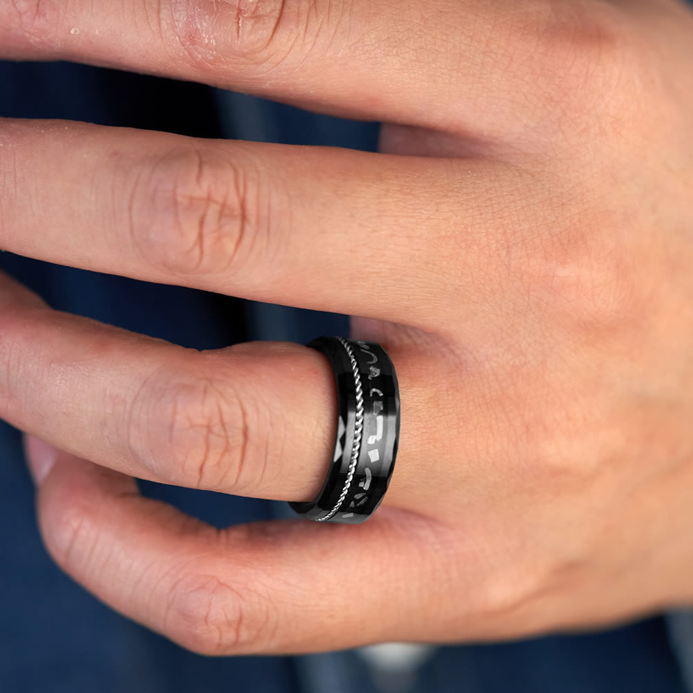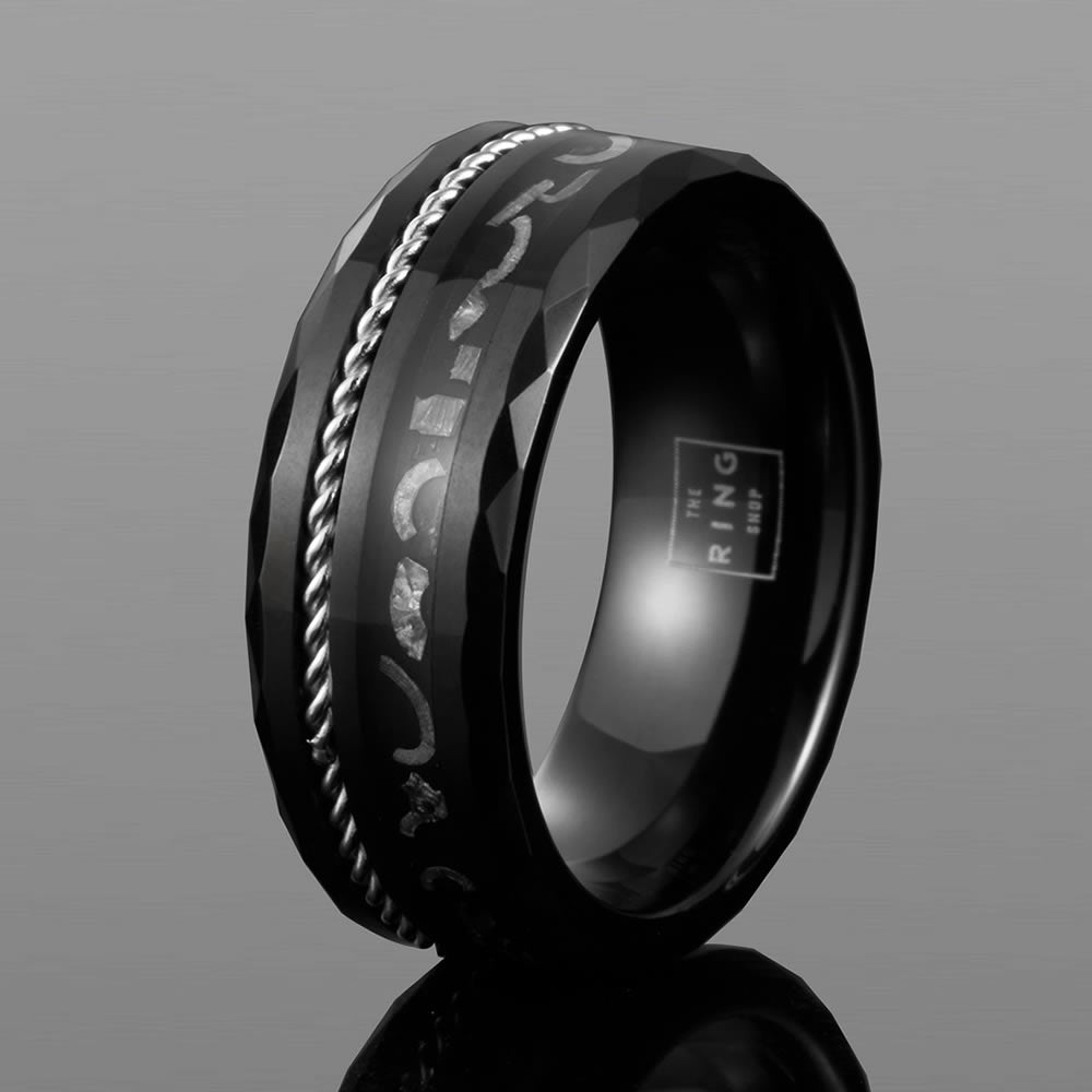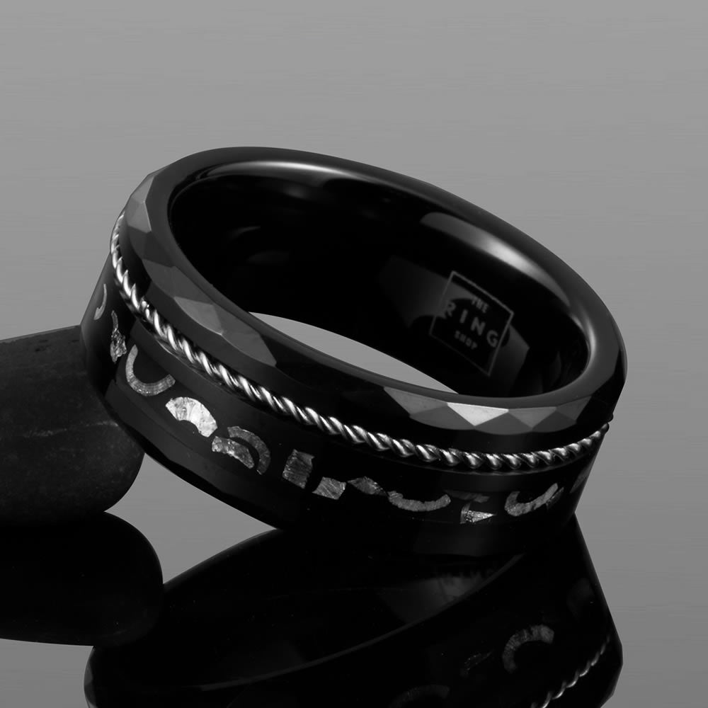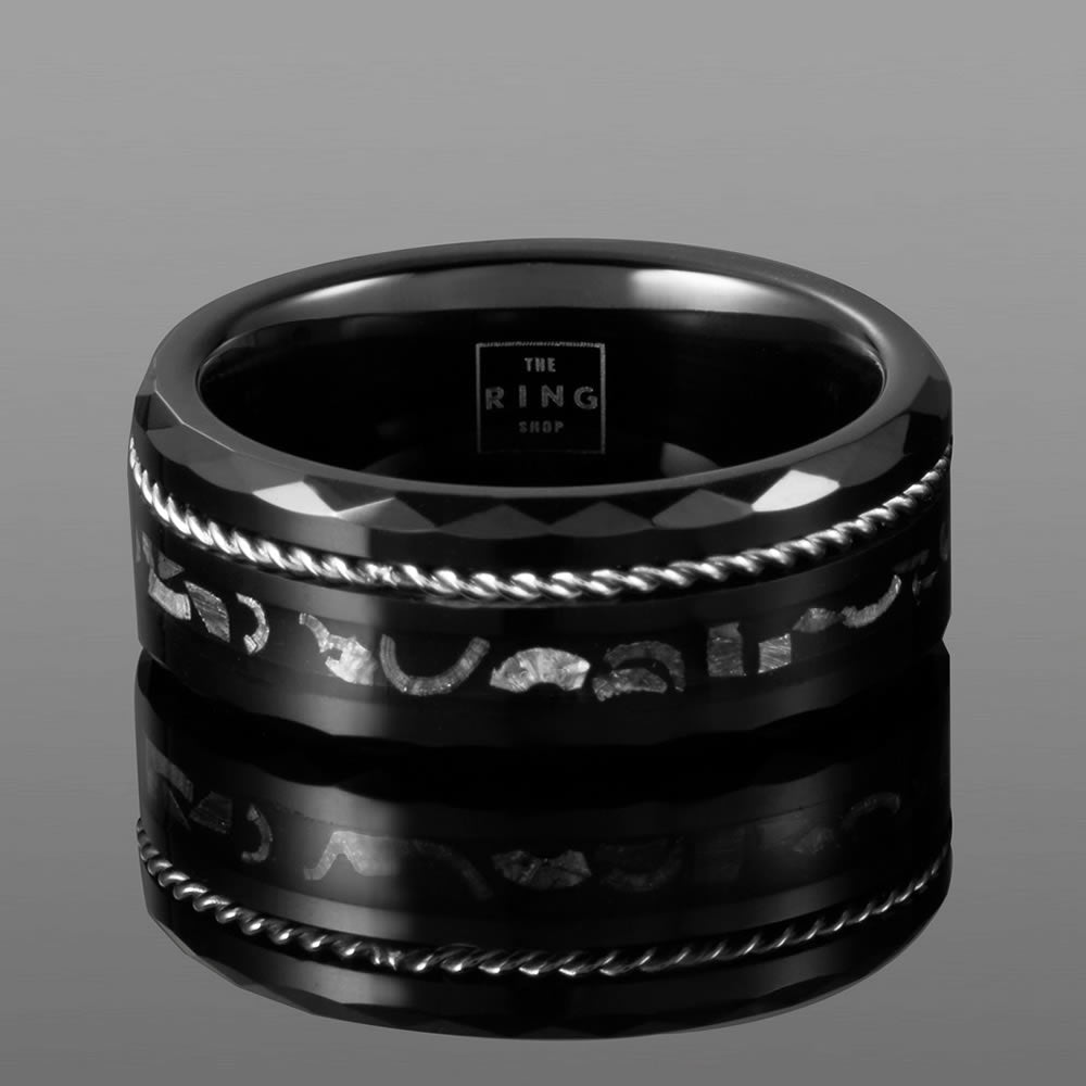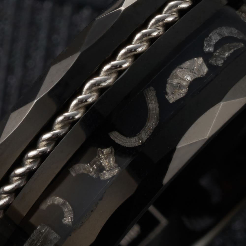 Eclipse is a unique design crafted with a durable faceted tungsten carbide body, inlaid with Muonionalusta meteorite fragments and a silver steel twine to finish.