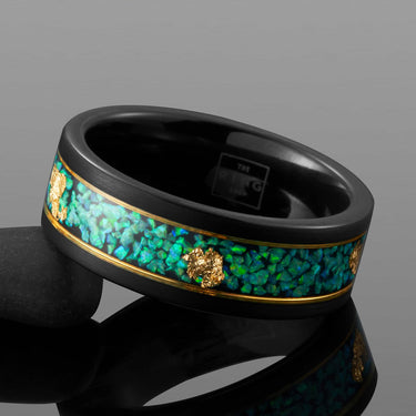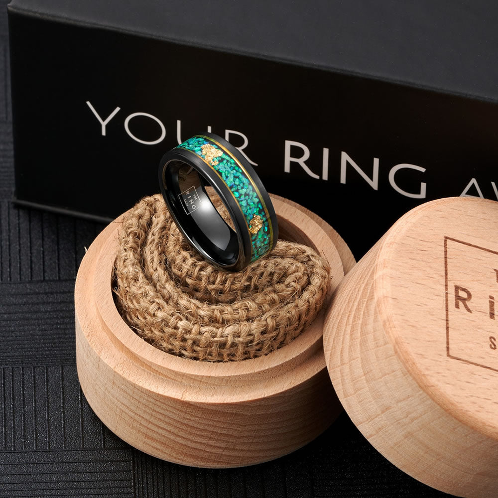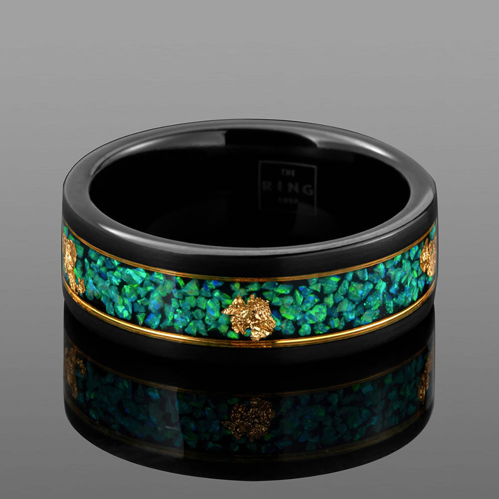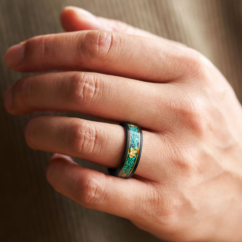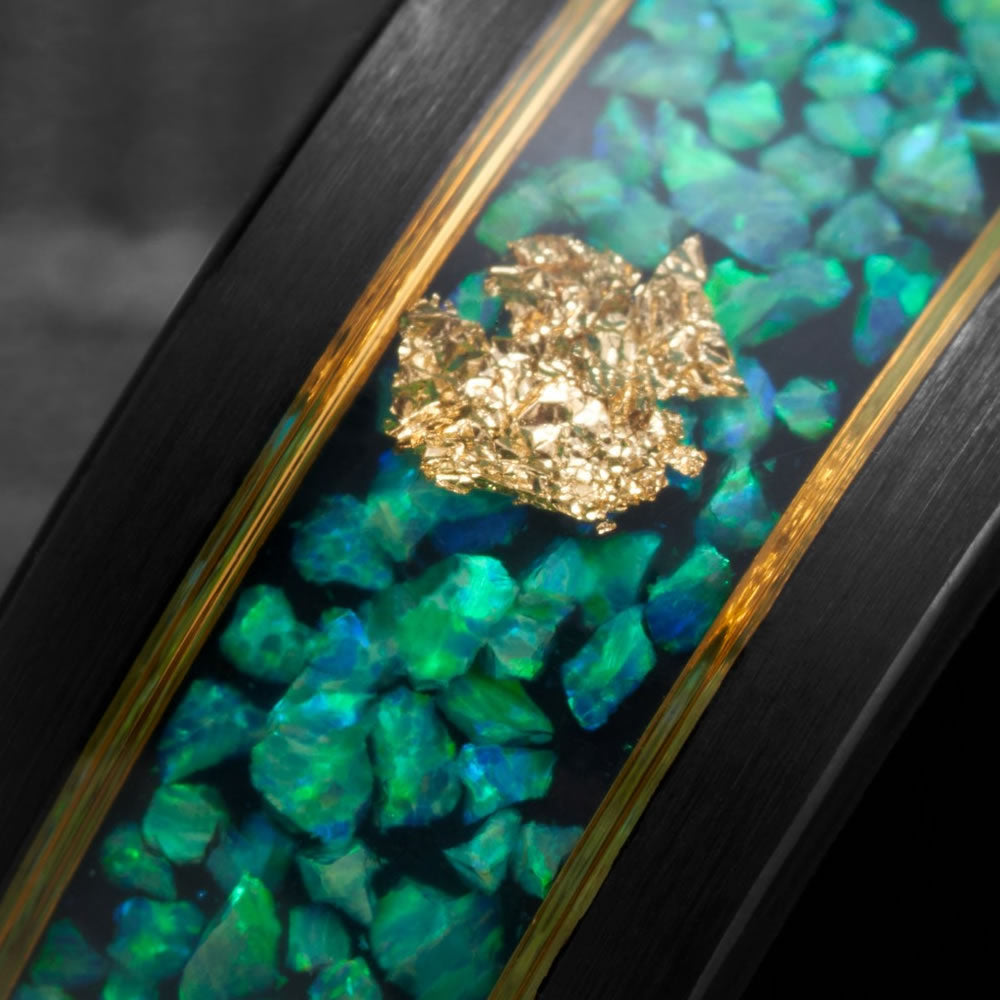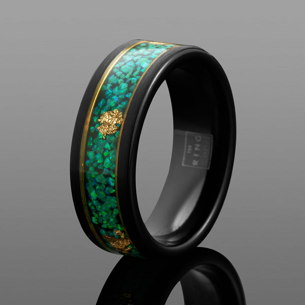 For a unique design that offers the Midas touch, look no further than this hand-crafted piece. Midas is crafted from durable tungsten carbide, and inlaid with blue-green crushed opal stones and golden foil, resulting in a eye-catching ring suitable for daily wear.