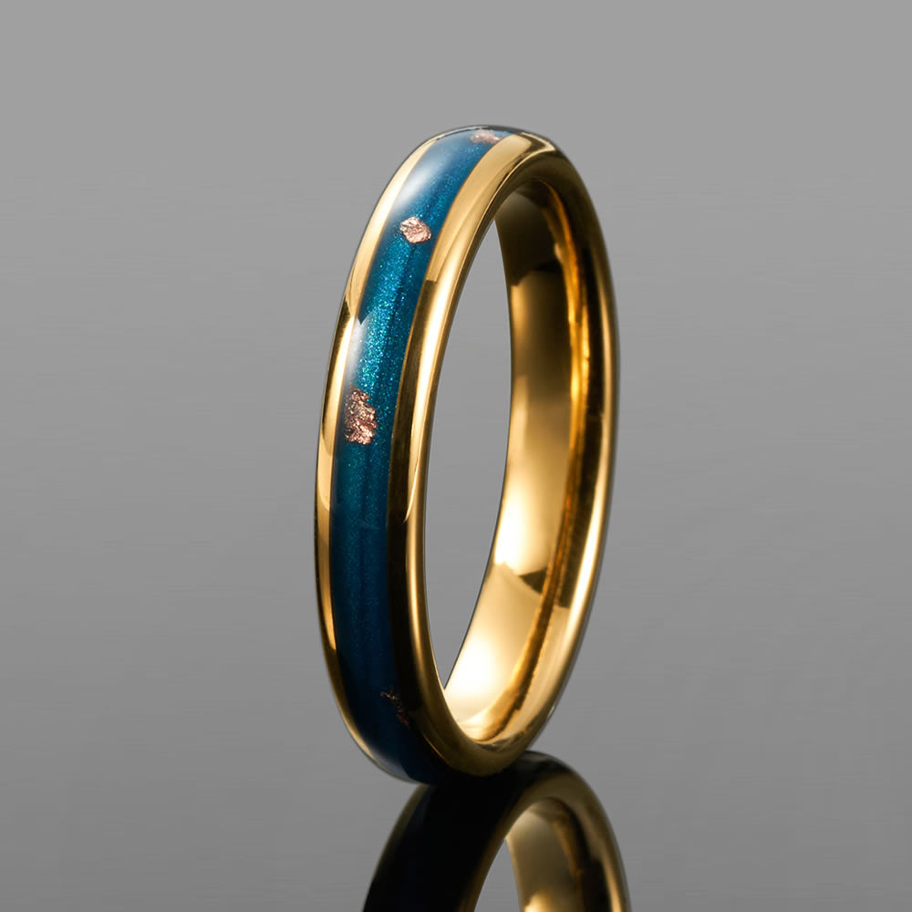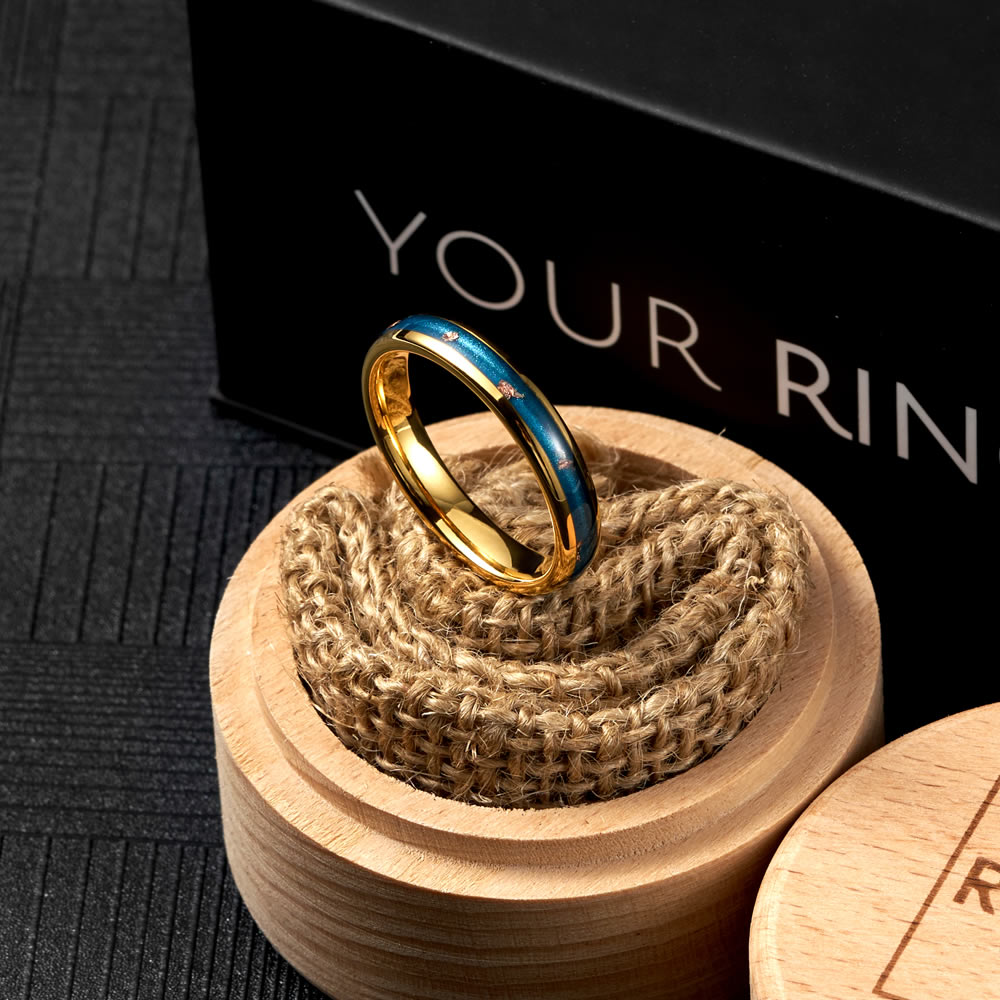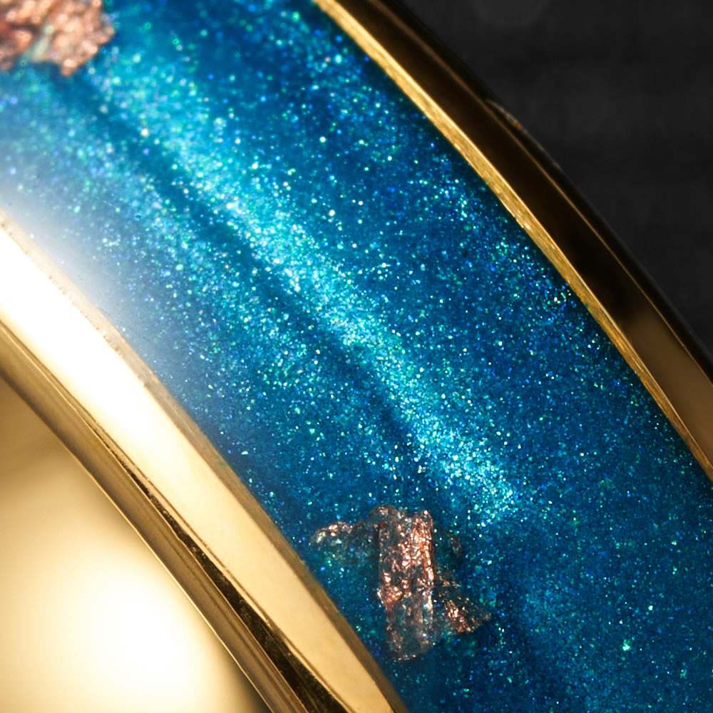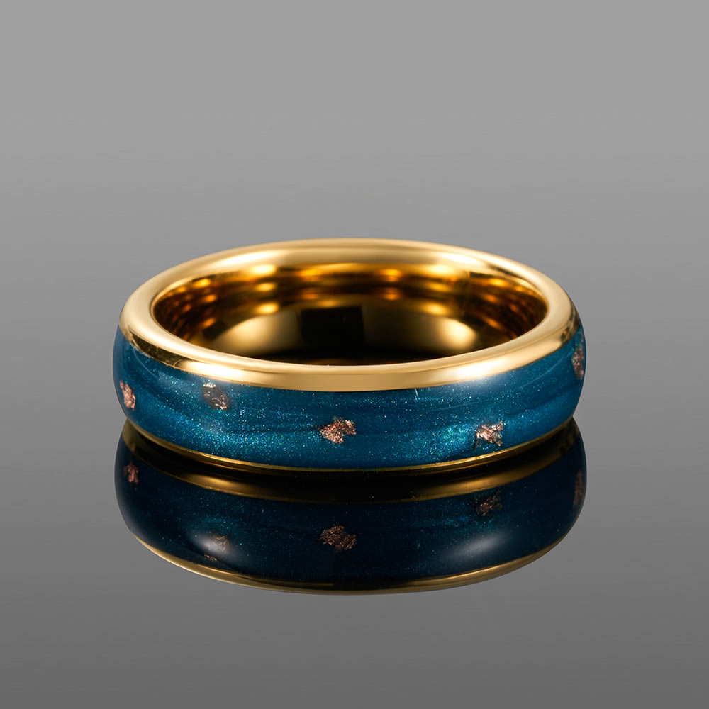 Solaris is a striking balance of materials, combining tungsten carbide with blue sandstone and gold foil inlay. For a look that's eye-catching and durable, Solaris is your ring.