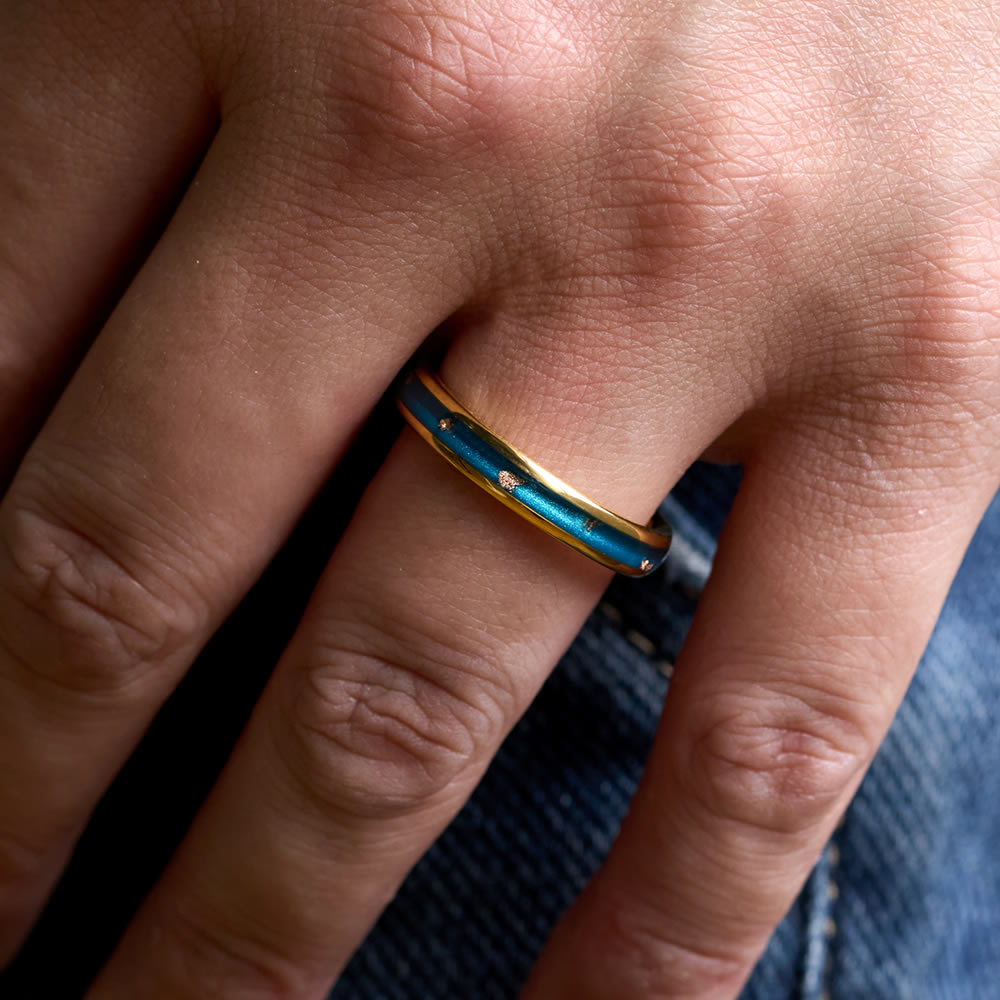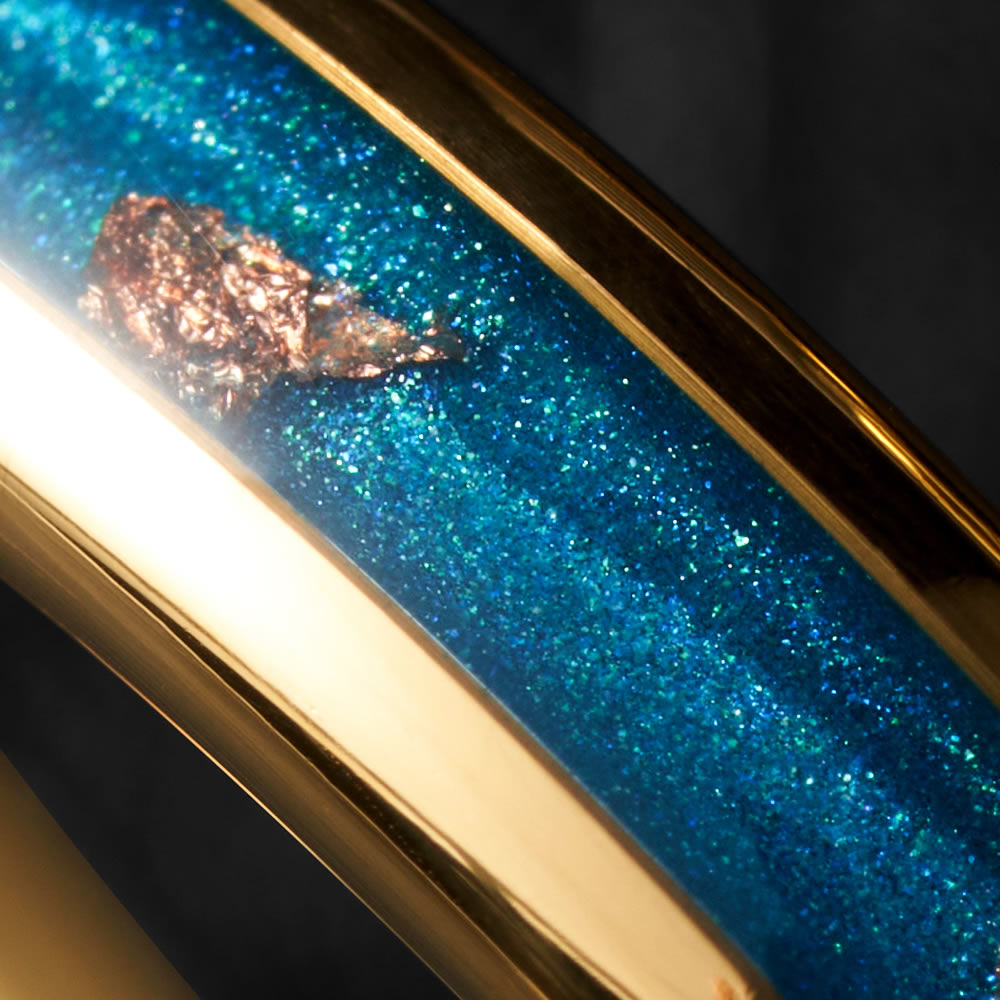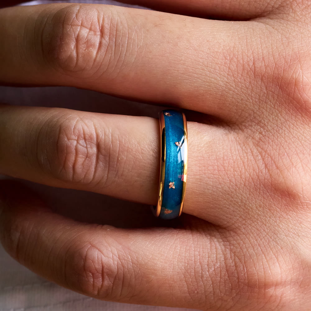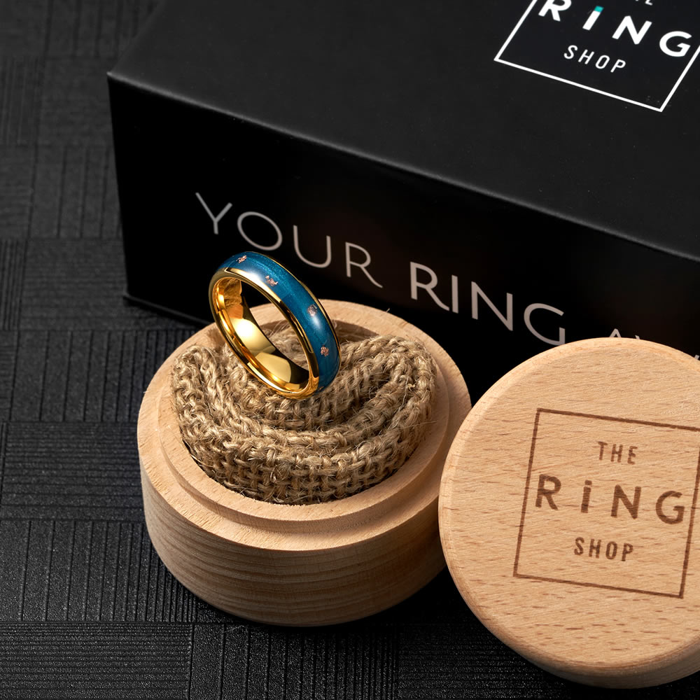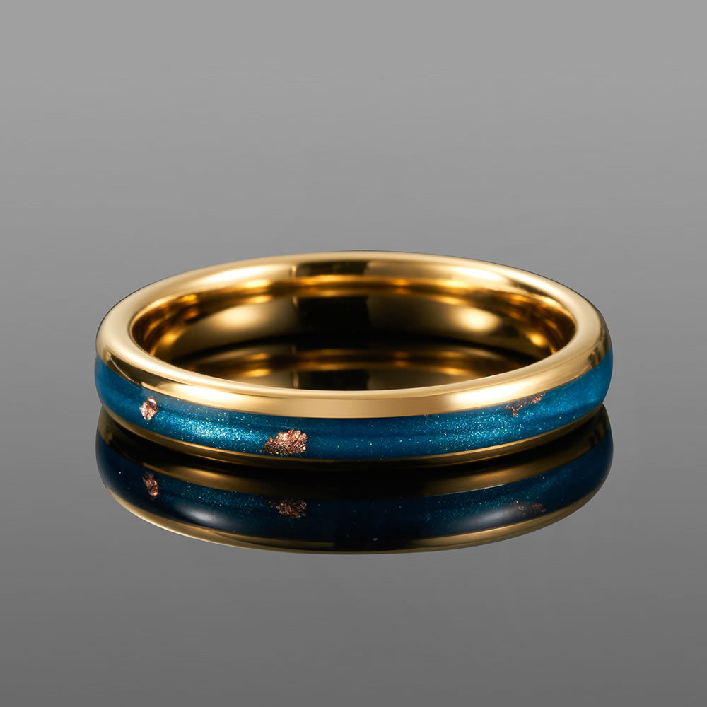 Solaris is a striking balance of materials, combining tungsten carbide with blue sandstone and gold foil inlay. For a look that's eye-catching and durable, Solaris is your ring.