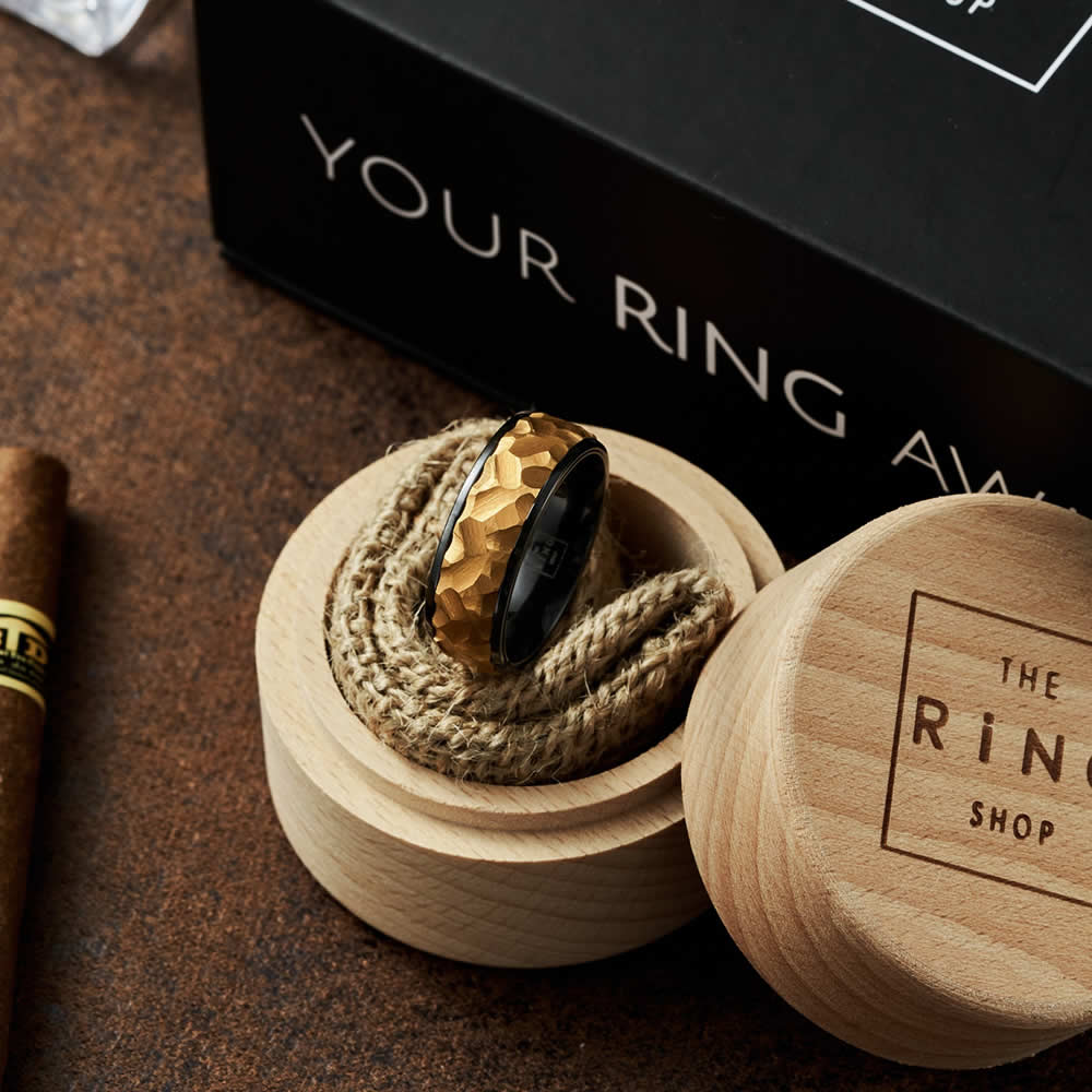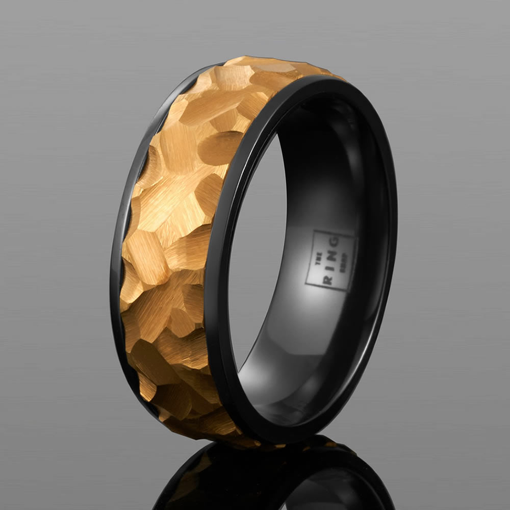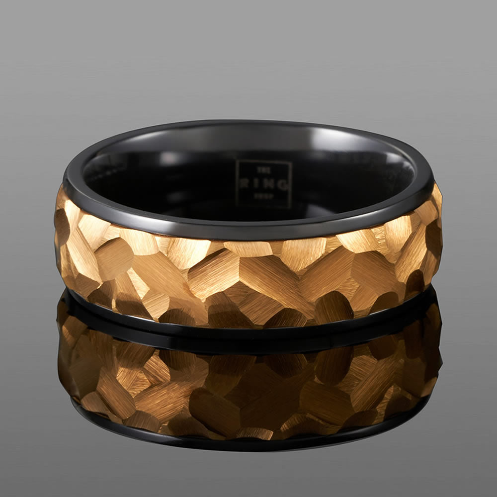Apollo is meticulously crafted from a brushed gold ion-plated hammered tungsten carbide inlay, set in a polished black tungsten carbide sleeve. Being both durable and stylish, Apollo is your perfect every day piece.