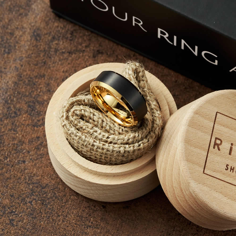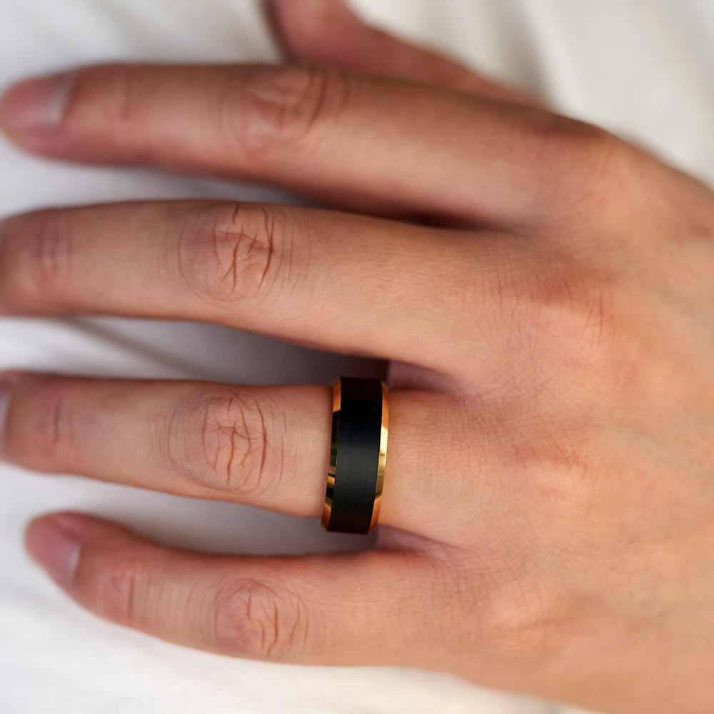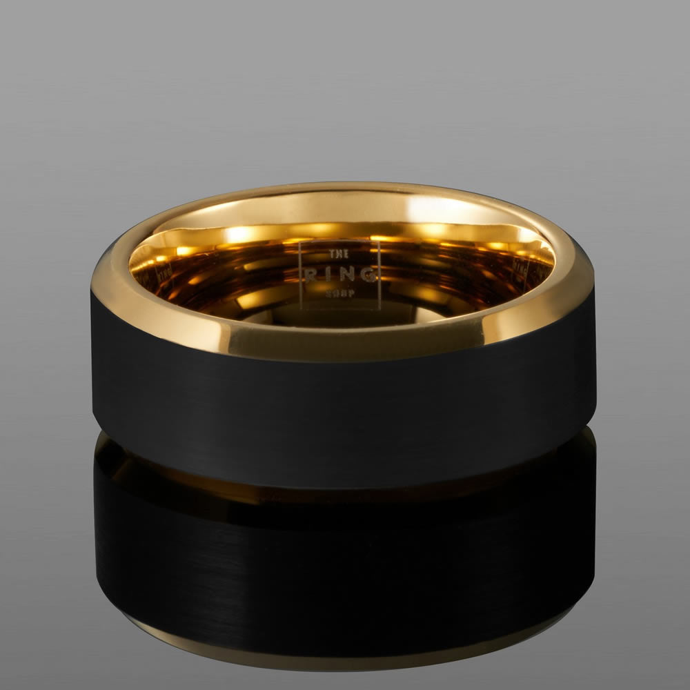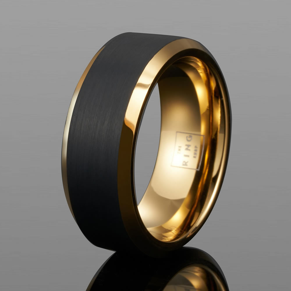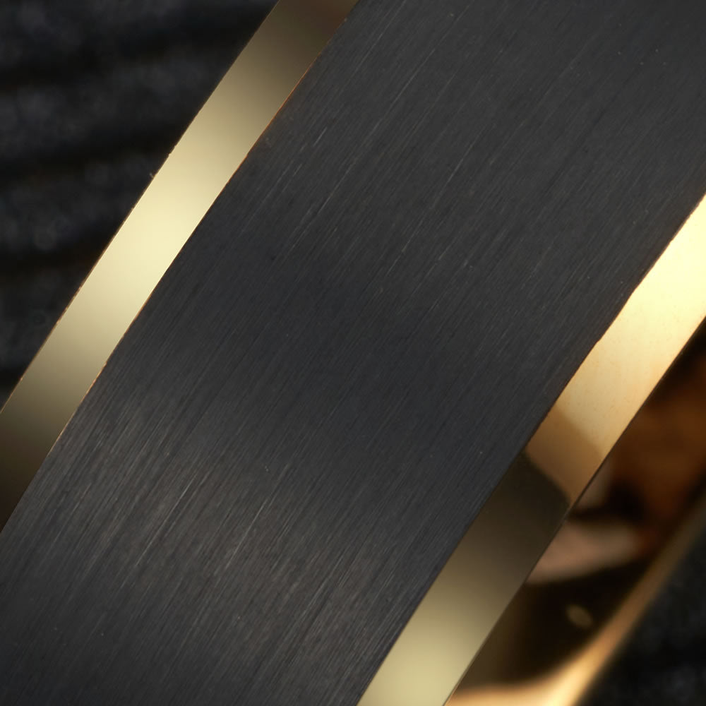 Goldsmith is sleek and graceful piece forged from pure tungsten carbide. The central black brushed tungsten carbide inlay defines this piece, sitting within a polished gold ion-plated inner sleeve.