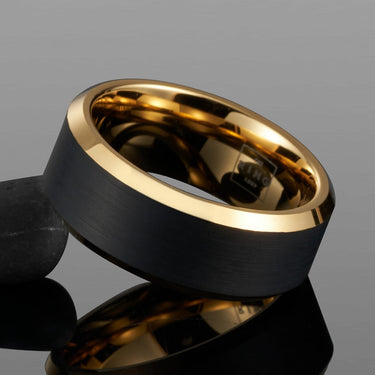 Goldsmith is sleek and graceful piece forged from pure tungsten carbide. The central black brushed tungsten carbide inlay defines this piece, sitting within a polished gold ion-plated inner sleeve.