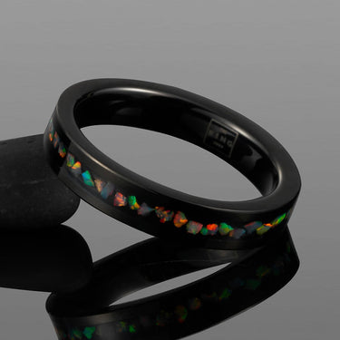 The inlaid opal stones within the ring displays a mesmerising sea of colours that seems to shimmer and shine from any angle. Whilst seemingly delicate, the tungsten carbide build ensures an extremely durable ring as tough as diamond.