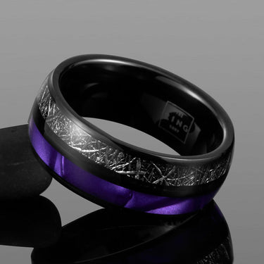 Twilight is named as such due to its two inlays: a swirling coloured polymer twinned with steel faux meteorite, protected by a scratch-resistant resin coating. This striking combination is inlaid into a durable tungsten carbide base to create an extraordinarily eye-catching band.