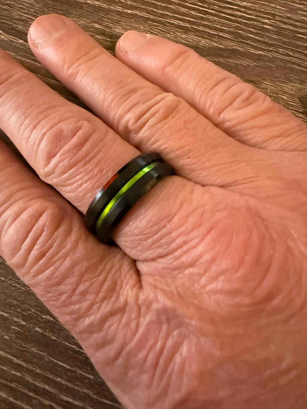 Nano is comprised of a tungsten carbide composite, with a matte black finish and green center plated groove. The edges are beveled and inside is polished to provide a comfortable fit.
