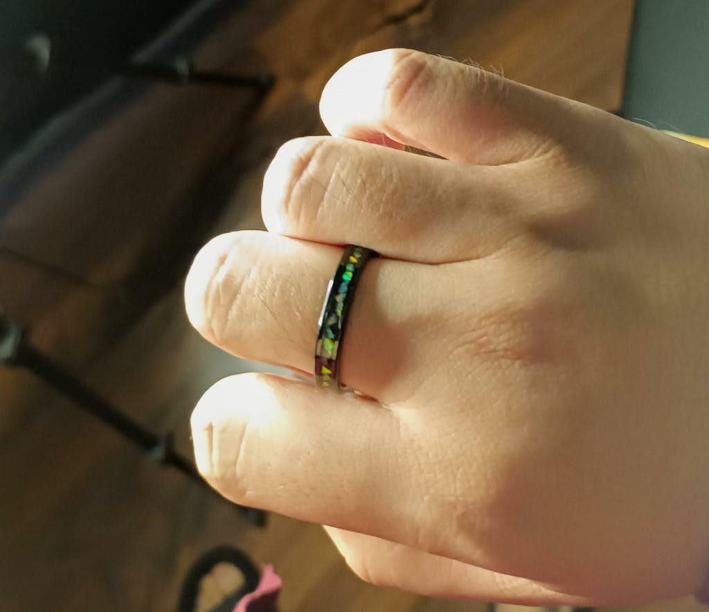 The inlaid opal stones within the ring displays a mesmerising sea of colours that seems to shimmer and shine from any angle. Whilst seemingly delicate, the tungsten carbide build ensures an extremely durable ring as tough as diamond.