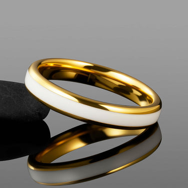 Marquess is a sophisticated fusion of strength and elegance, featuring a gold tungsten carbide body with a sleek white epoxy inlay. Designed as a refined band, it offers a modern, polished look that's both durable and eye-catching.