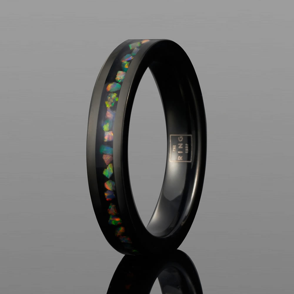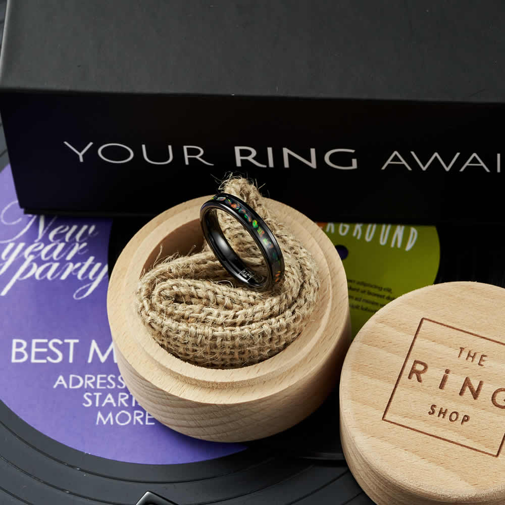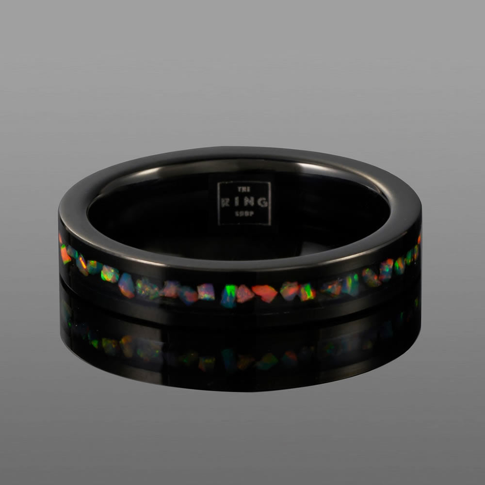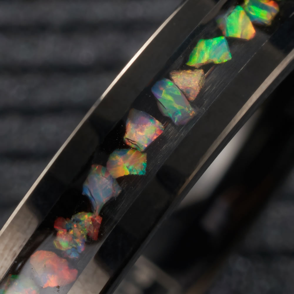 The inlaid opal stones within the ring displays a mesmerising sea of colours that seems to shimmer and shine from any angle. Whilst seemingly delicate, the tungsten carbide build ensures an extremely durable ring as tough as diamond.
