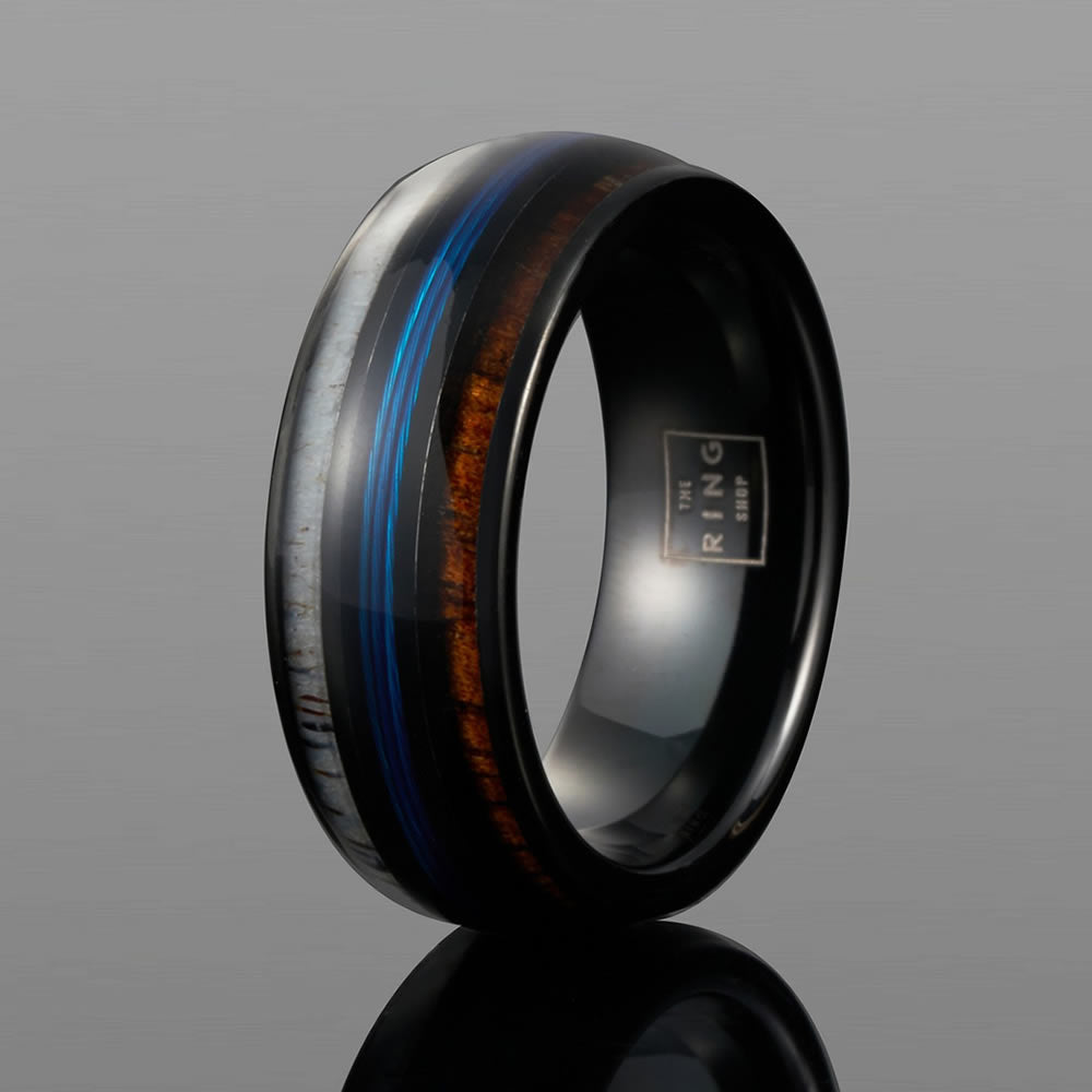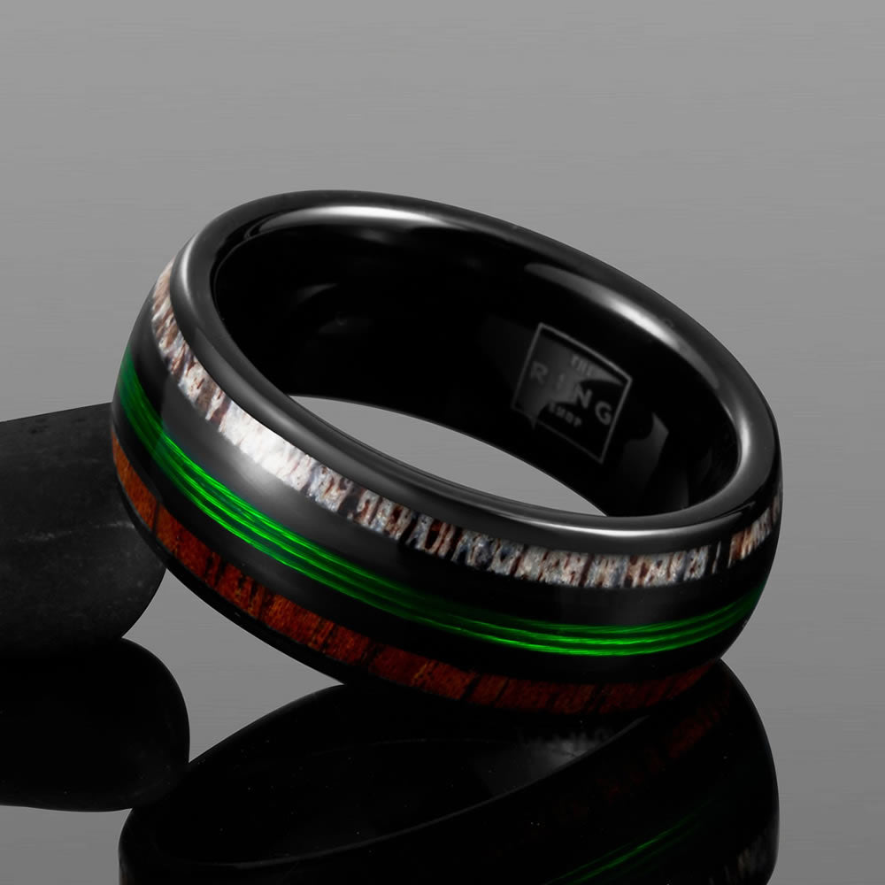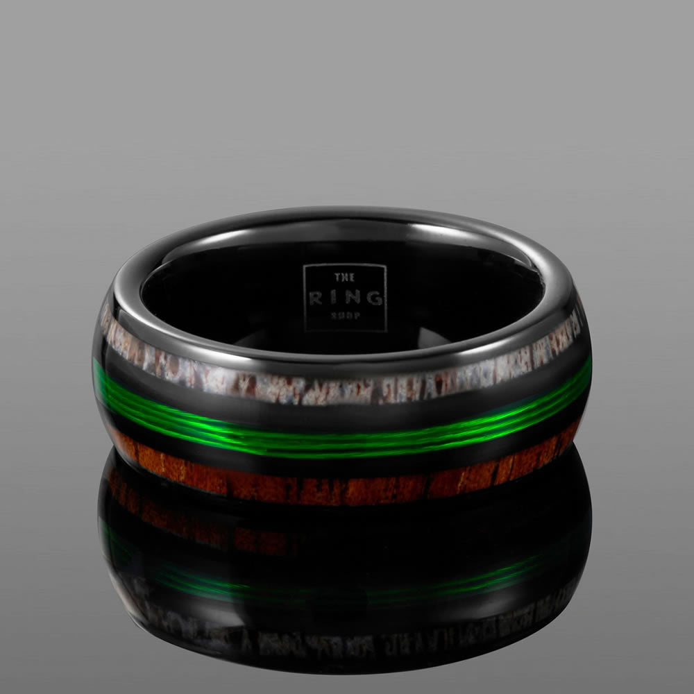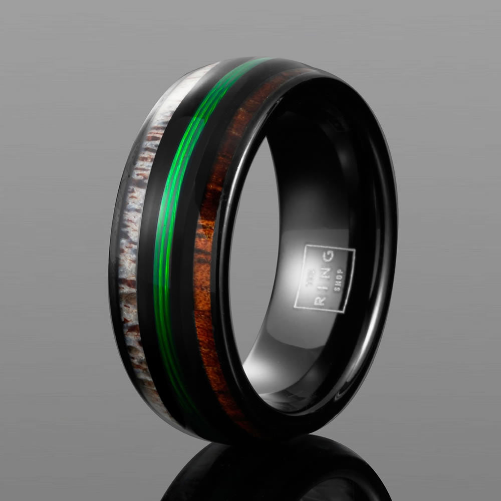 Expertly crafted with a harmonious blend of Tungsten Carbide, Sustainable Deer Antler, and genuine Acacia Wood, Sigma is a durable, one-of-a-kind piece.