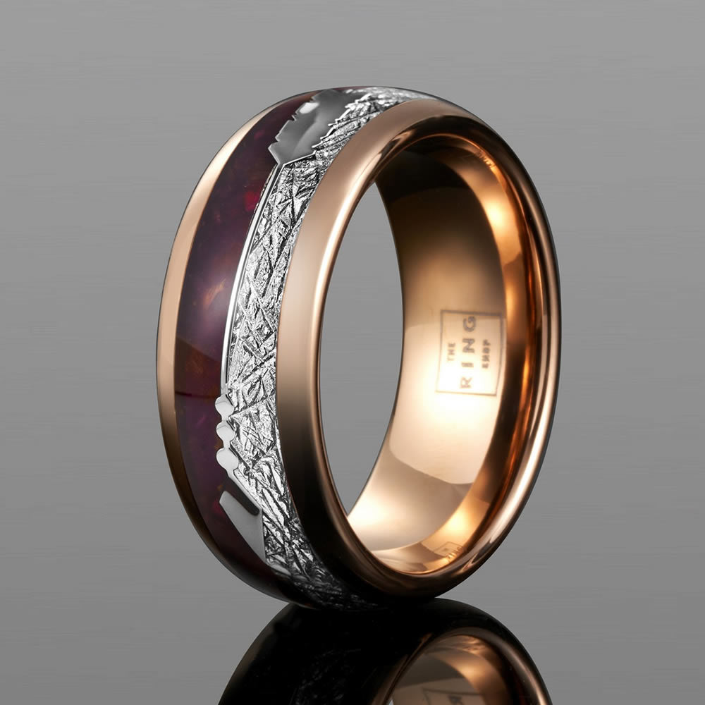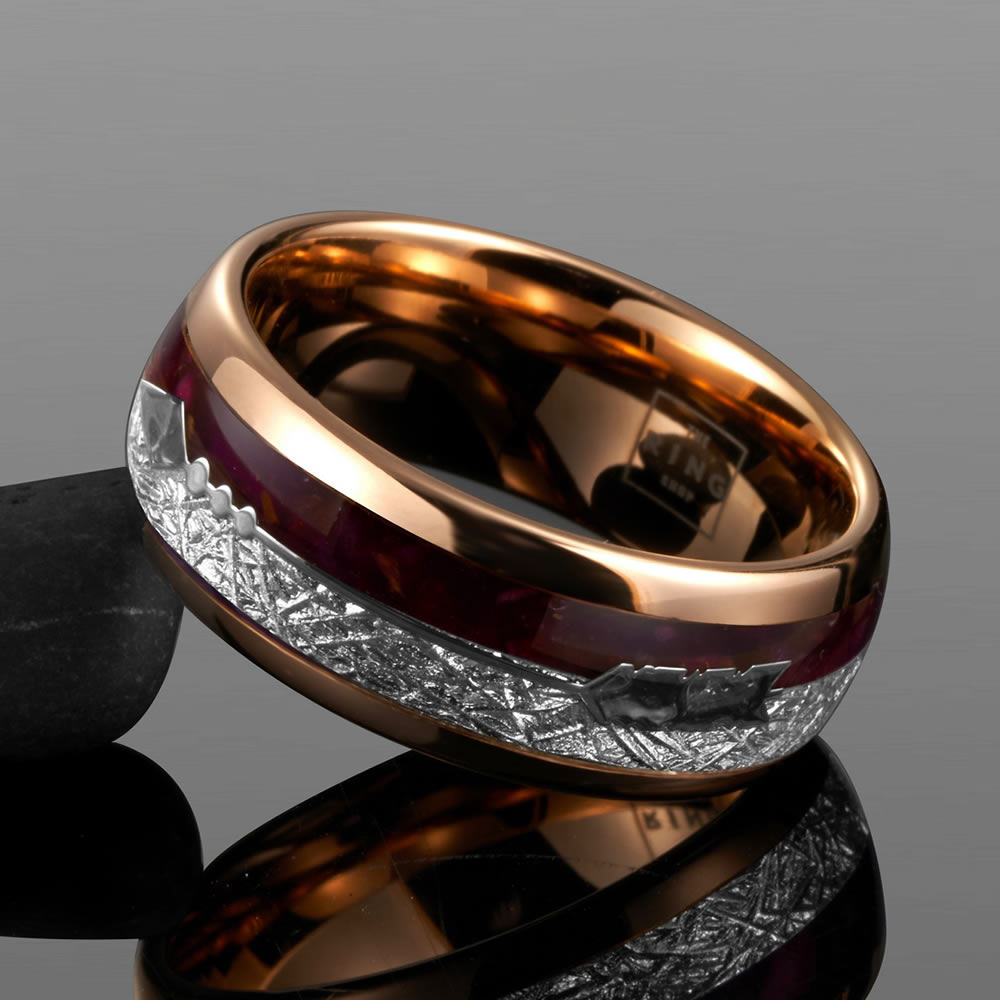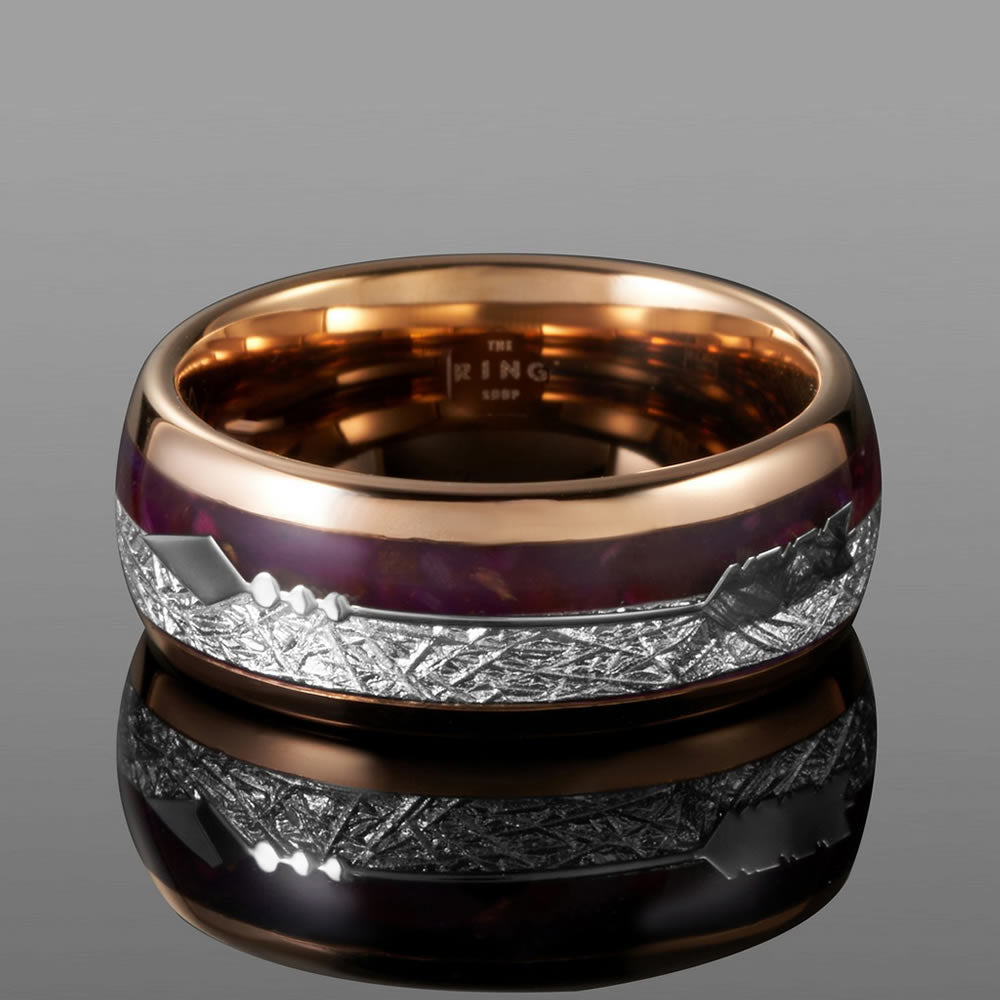 Siren comprises a unique blend of crushed purple lapiz lazuli gemstone, durable tungsten carbide and imitation meteorite to produce a unique ring design guaranteed to turn heads. An arrow inlay completes the set, with a polished inner face finish for comfort and fit.