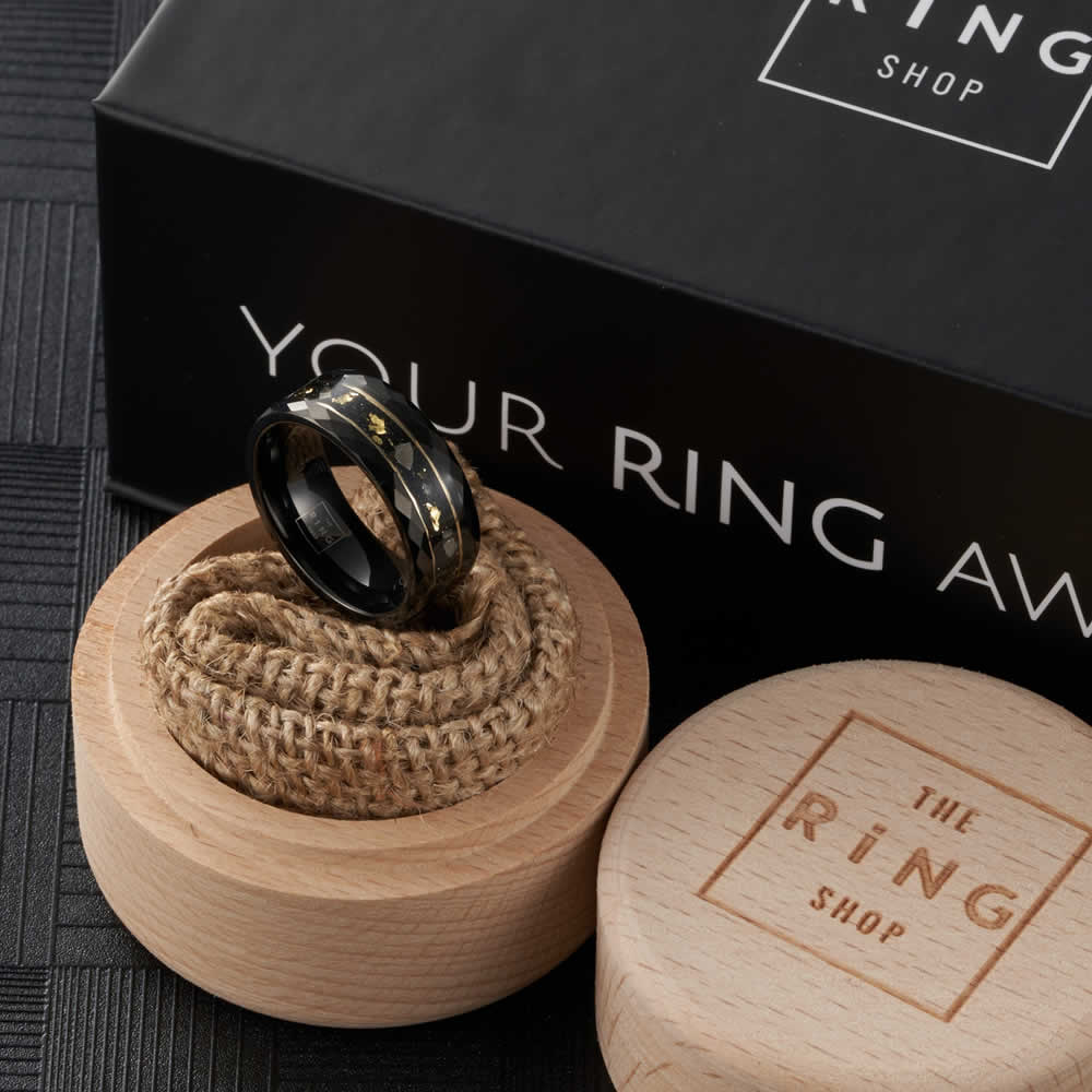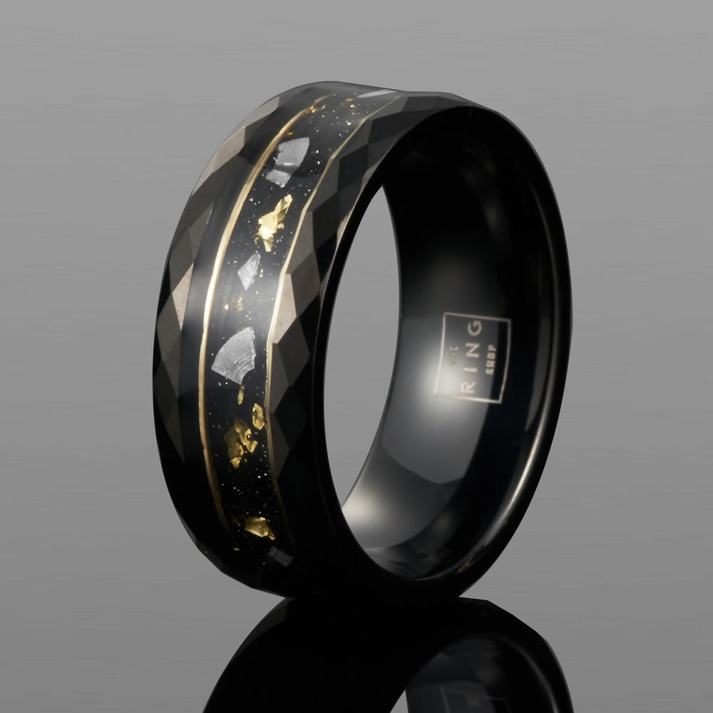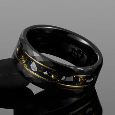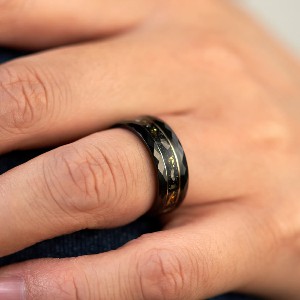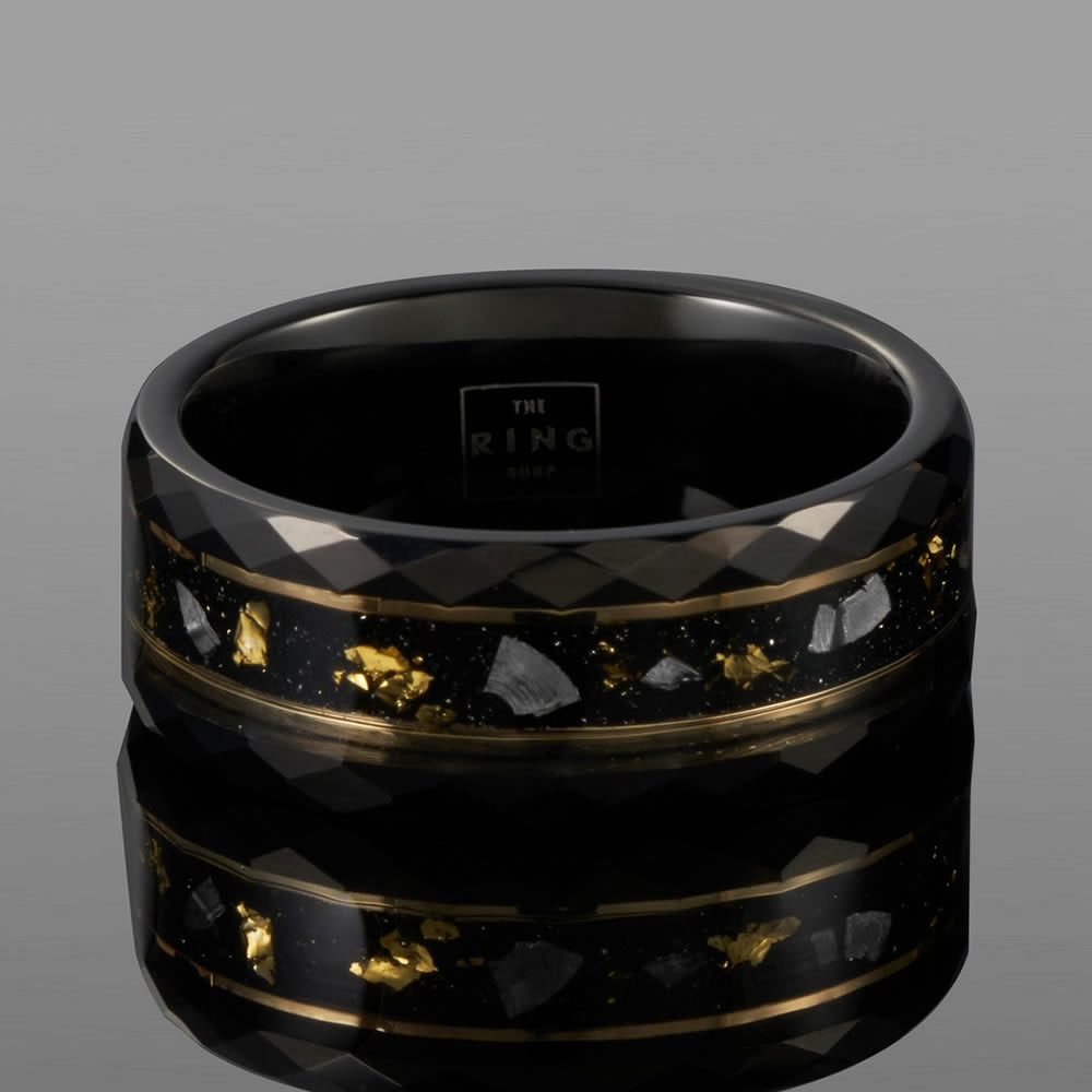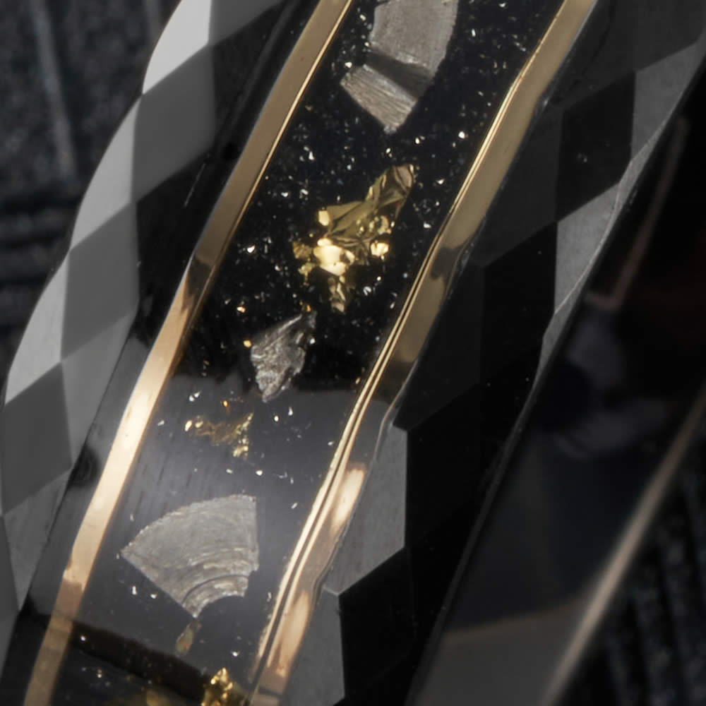 Turn heads with Dune - expertly crafted from faceted tungsten carbide, this ring features a captivating inlay of black sand, enriched with rare meteorite and gold foil.