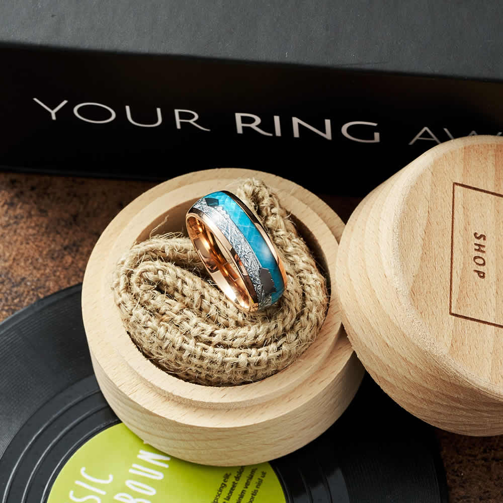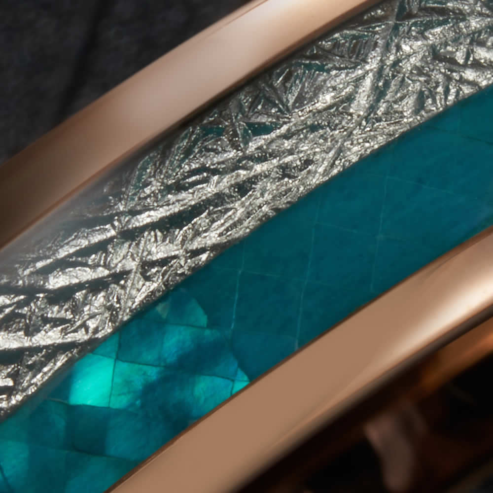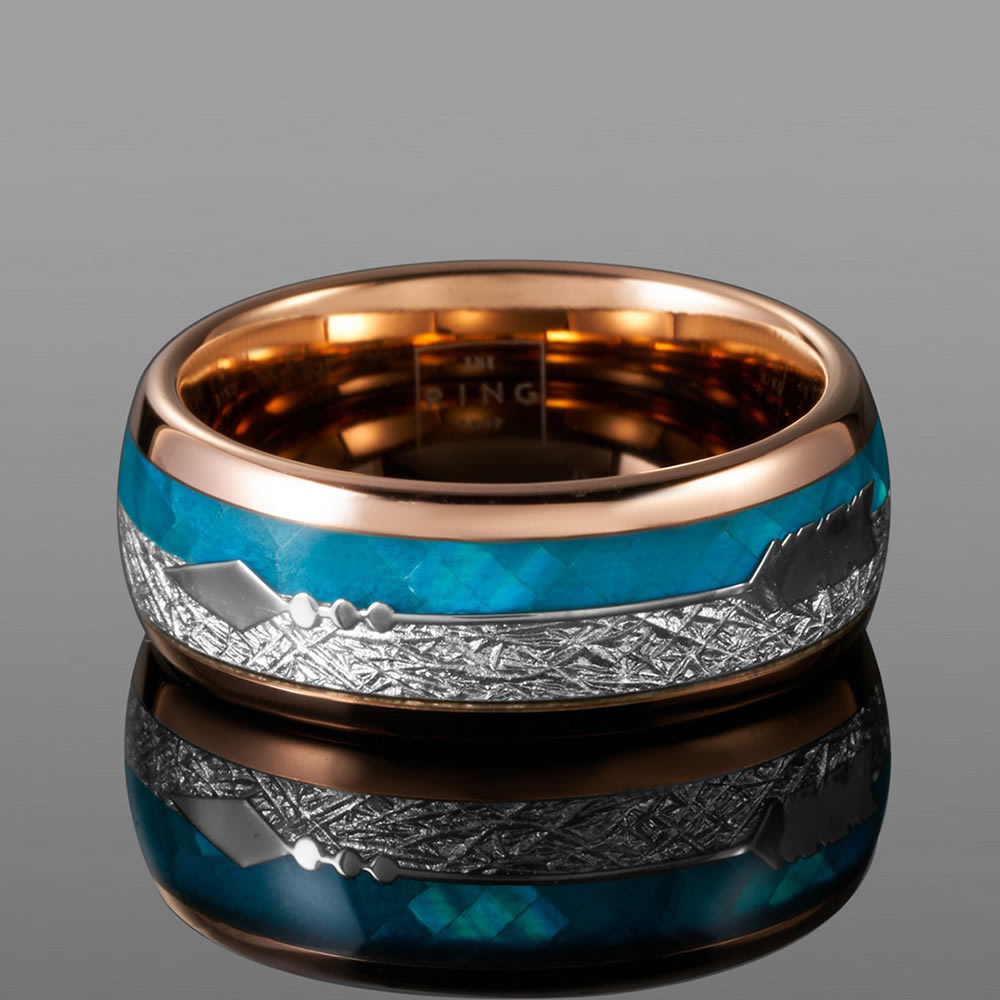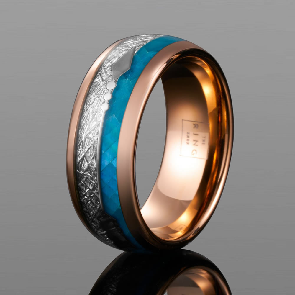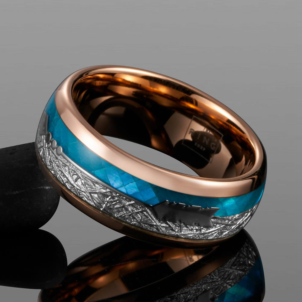 Golden Gale is comprised of a symphony of materials - blue inlaid shell, rose gold plating, imitation meteorite and tungsten carbide - to provide its unique and classic look. An arrow inlay completes the set, with a polished inner face finish for comfort and fit.