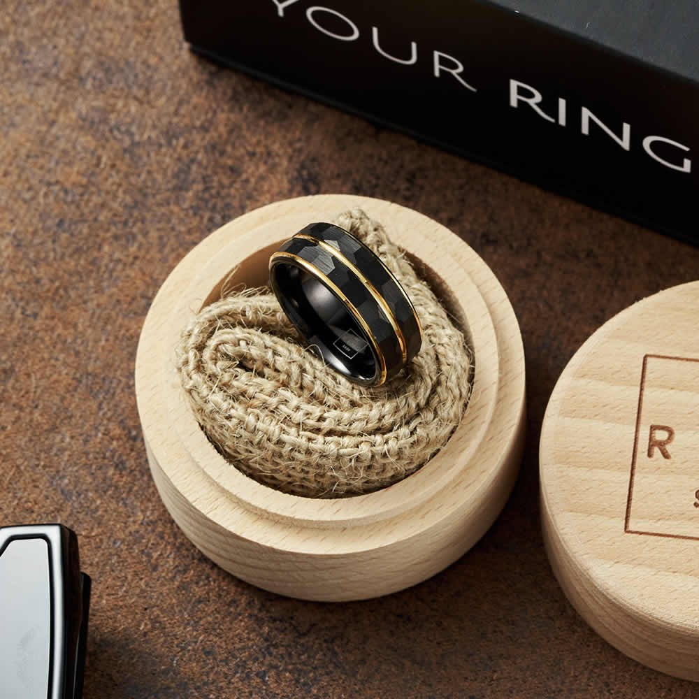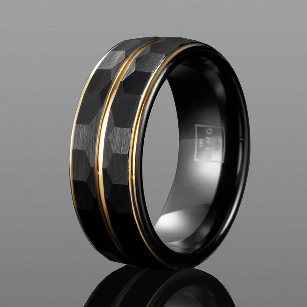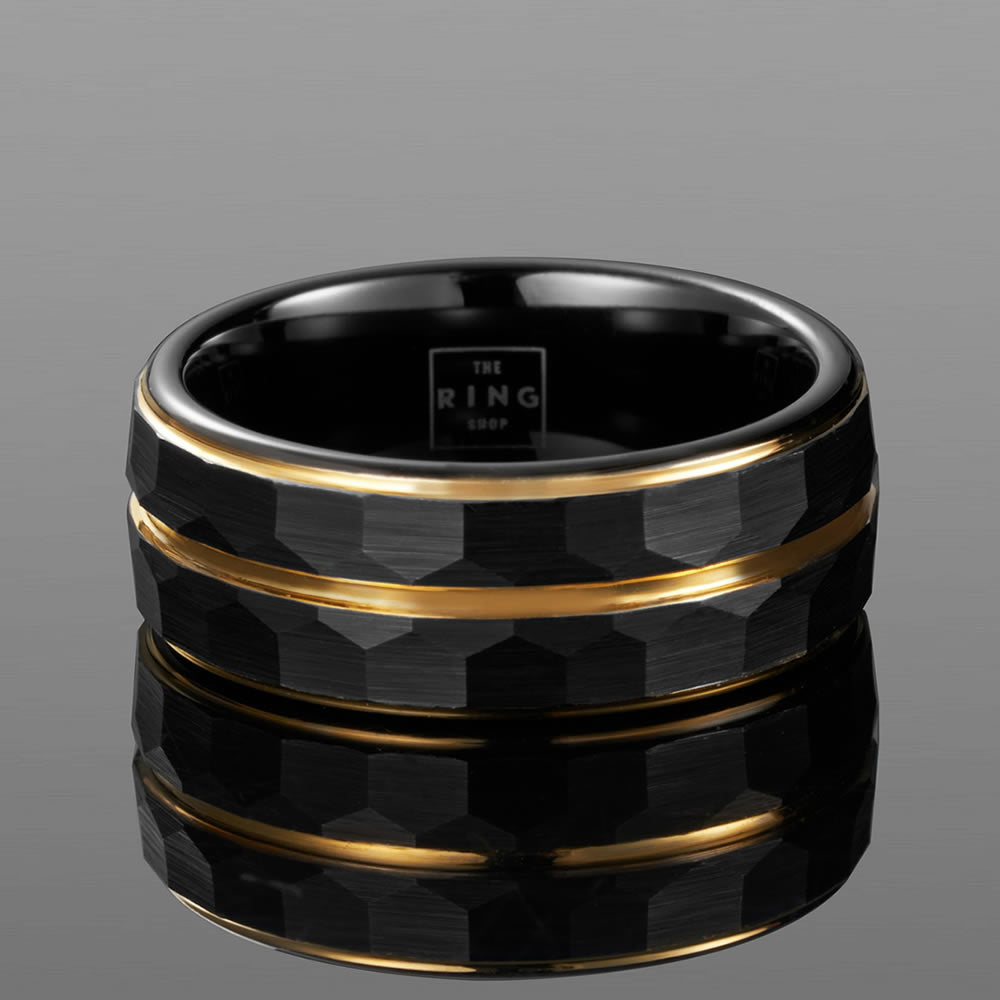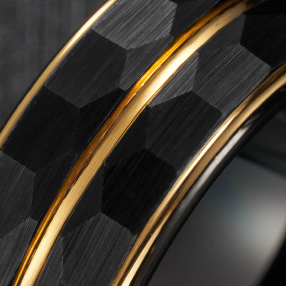 Onyx is one of our most exclusive rings, with ion-plated gold bands cutting through a black-brushed hexagonal finish. The sleek, professional ring is comprised of a tungsten carbide build for strength and durability, with a high quality polish to ensure a perfect comfort fit.