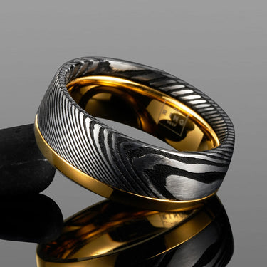 Regal is a stylish piece guaranteed to turn heads. Characterised by its intertwining brushed black and grey Damascus steel finish with a gold plated stainless steel base, this is a ring that is both eye-catching and durable.