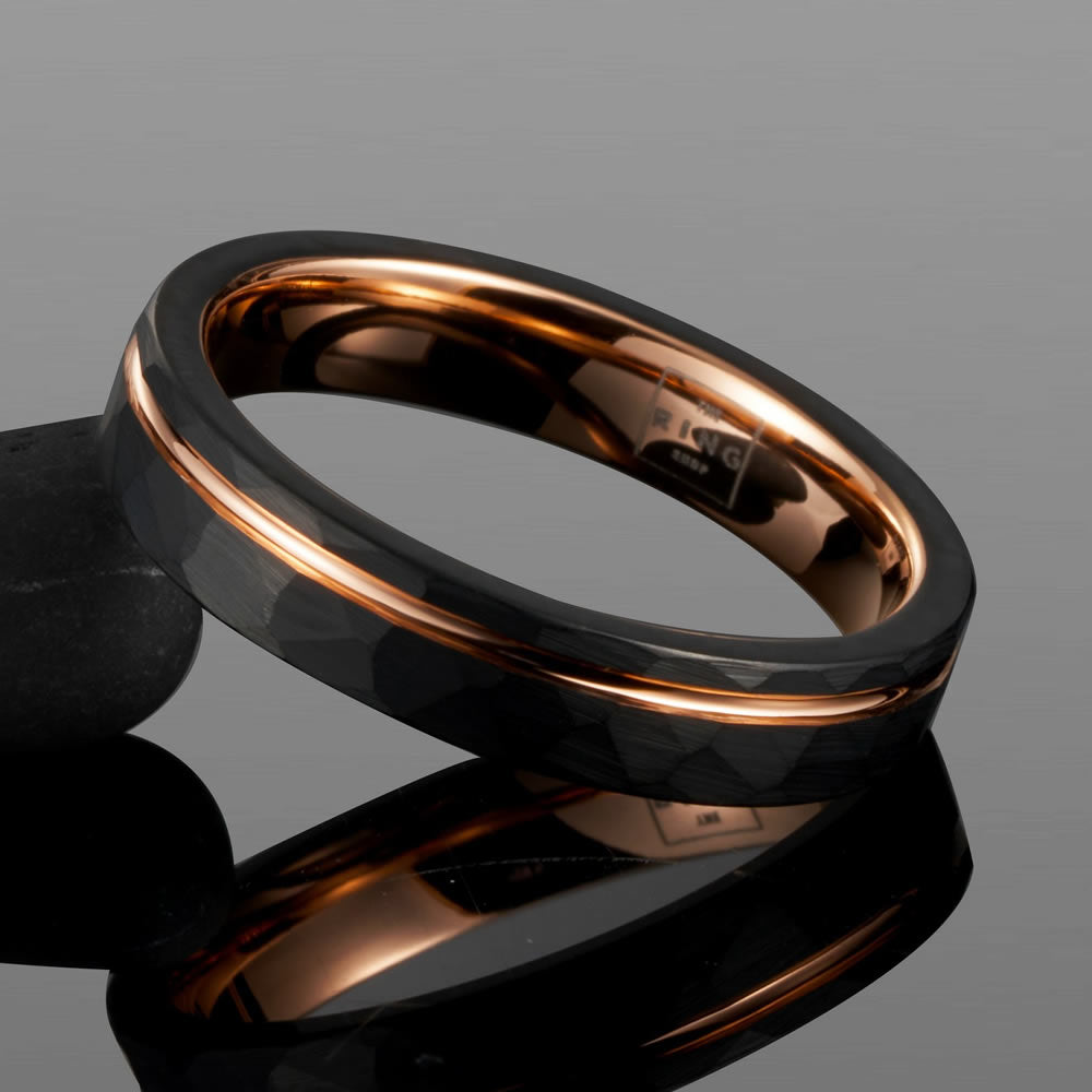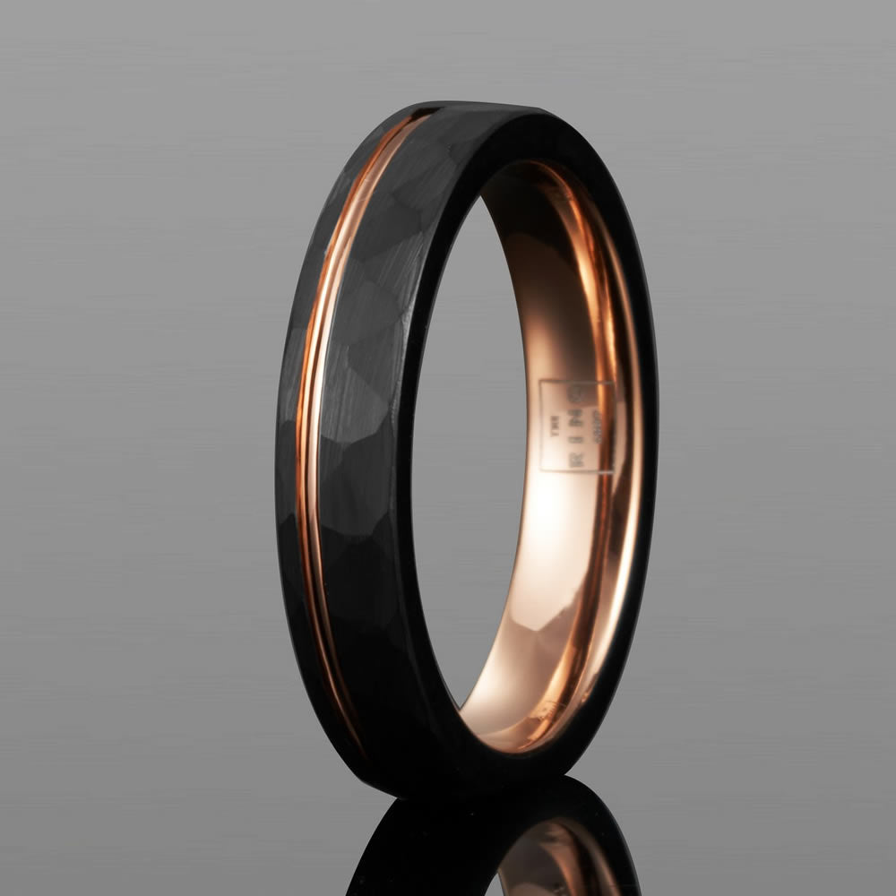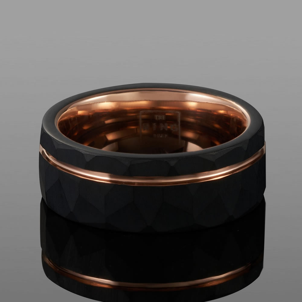 "Hammered tungsten carbide meets a gilded rose-gold edge - Titan is for statements that don’t need to shout."