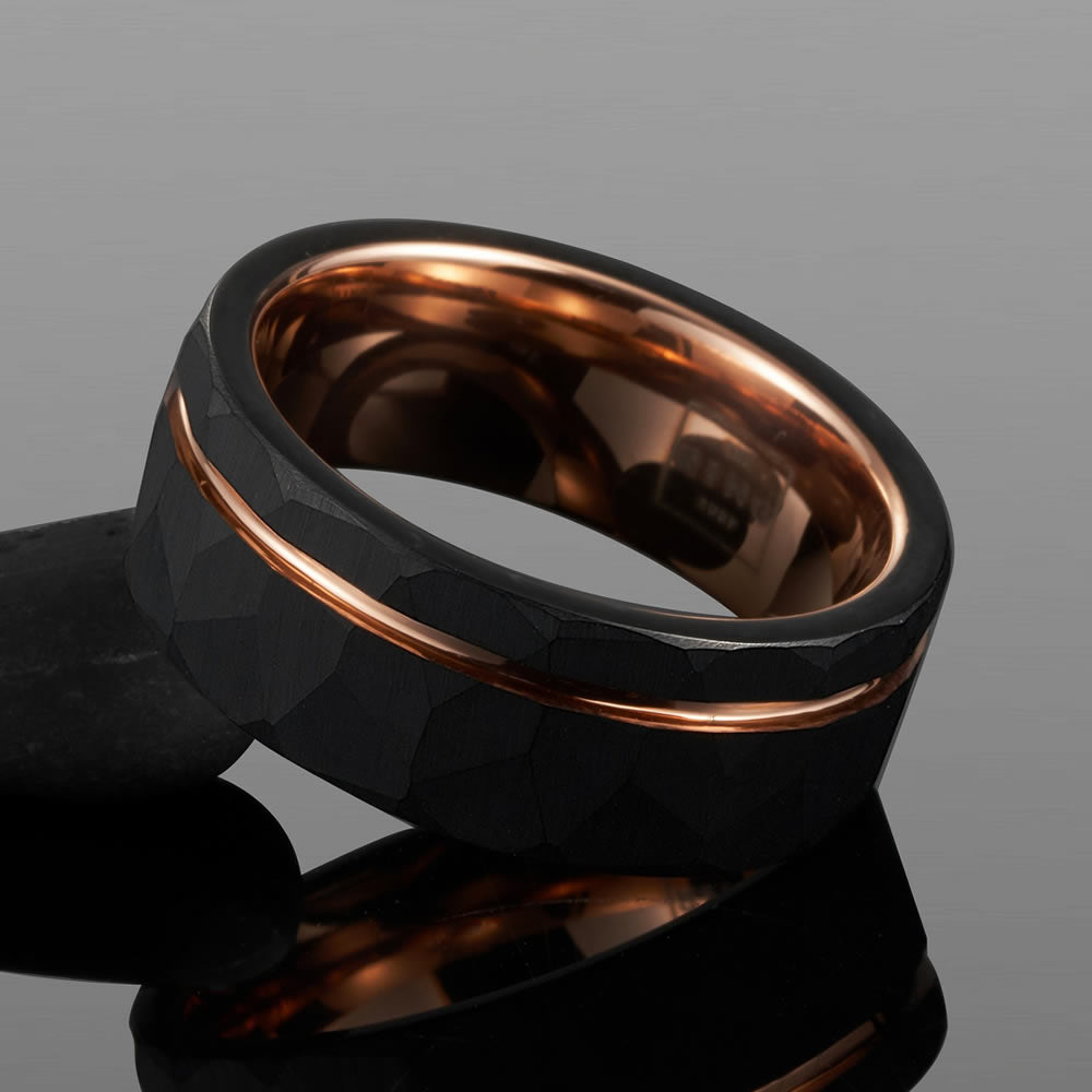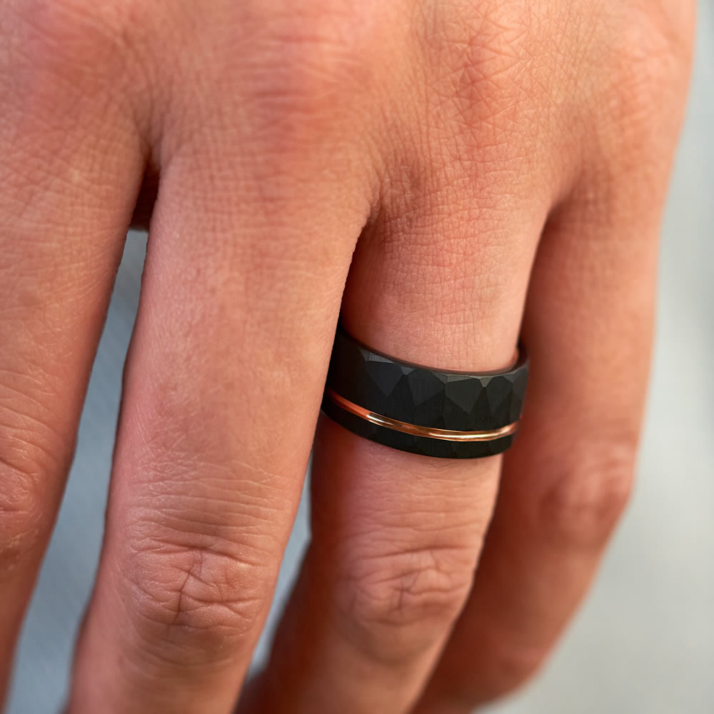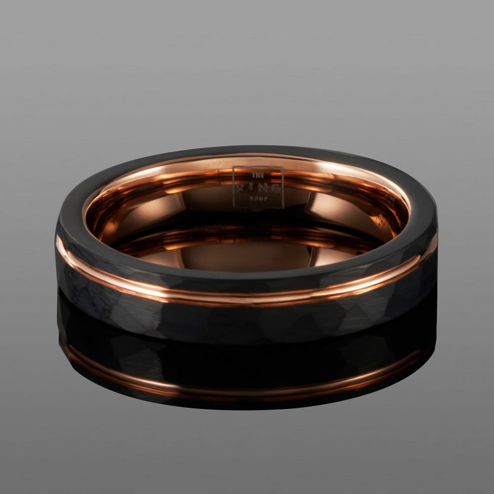 Titan is expertly crafted using hammered tungsten carbide, with a polished ion-plated rose gold trim. As one of our favourite designs, this piece is certainly one to turn heads.